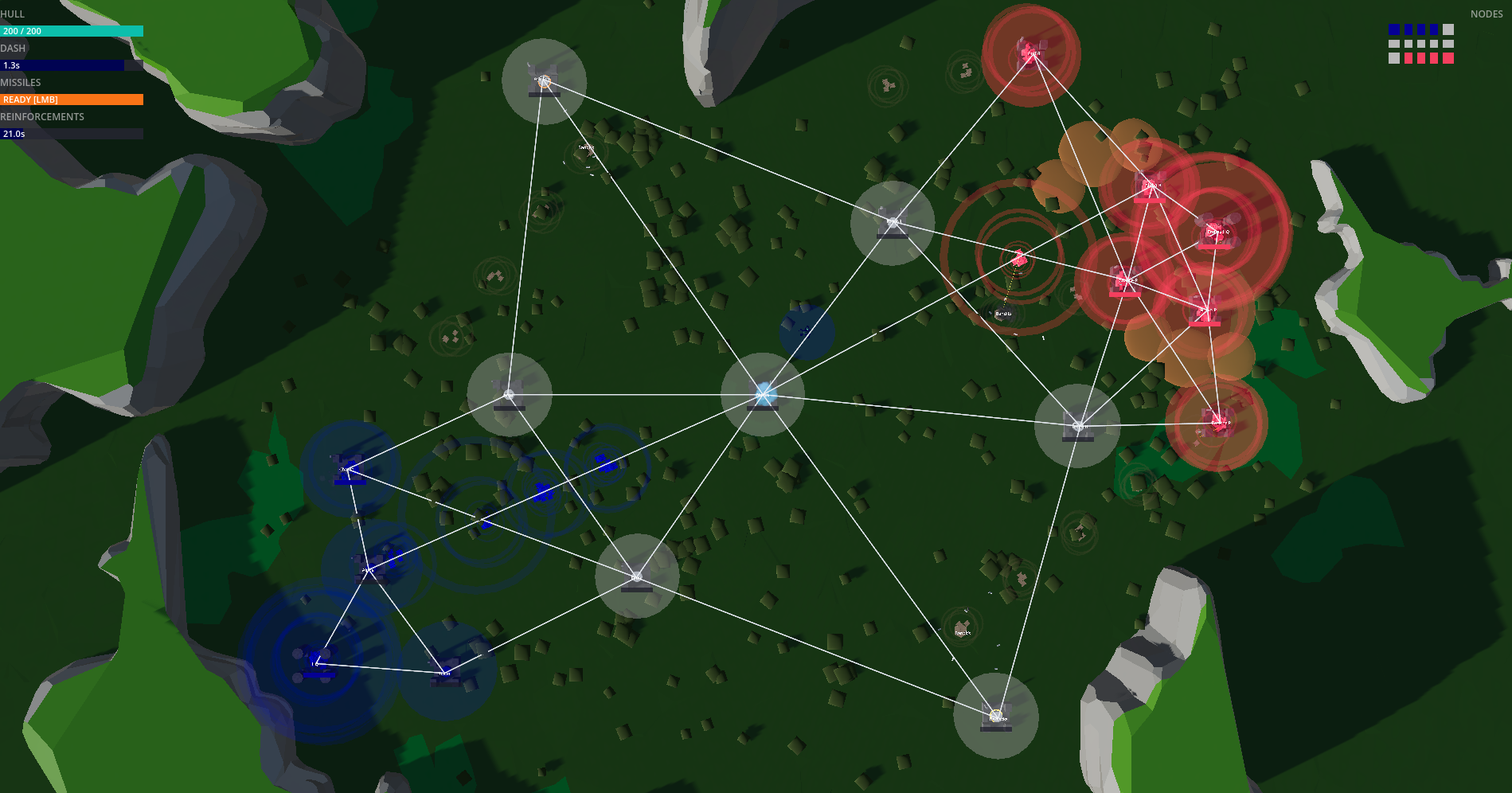 The map is a network of connected strategic nodes. Each node produces units while you own it and it's not under attack.